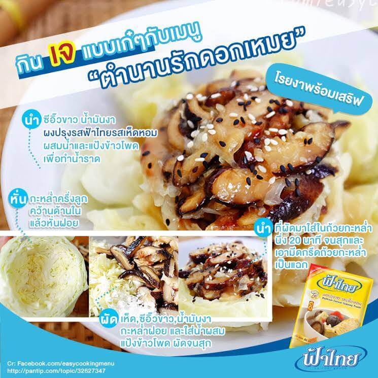 กินเจปีนี้ทำอาหารอร่อยๆหน้าตาเริ่ดๆกันดีกว่าค่ะ ฟ้าไทยขอแชร์สูตรตำนานรักดอกเหมยซึ่งเสริฟในถ้วยกะหล่ำปลีรูปดอกเหมย นอกจากหน้าตาสวยแล้วยังเปี่ยมไปด้วยคุณค่าอีกด้วยค่ะ เริ่มจากเตรียมส่วนผสมคือ 1. เห็ดหอมดอกใหญ่ 3 ดอก (แช่น้ำให้นิ่ม) หั่นเป็นเส้นๆ 2. แป้งข้าวโพด 2 ช้อนชา 3. ซีอิ๊วขาว 3 ช้อนโต๊ะ 4. น้ำมันงา 2 ช้อนชา 5. Seasoning Powderฟ้าไทยMushroom 6. งาขาว งาดำคั่ว 7. หัวกะหล่ำปลี