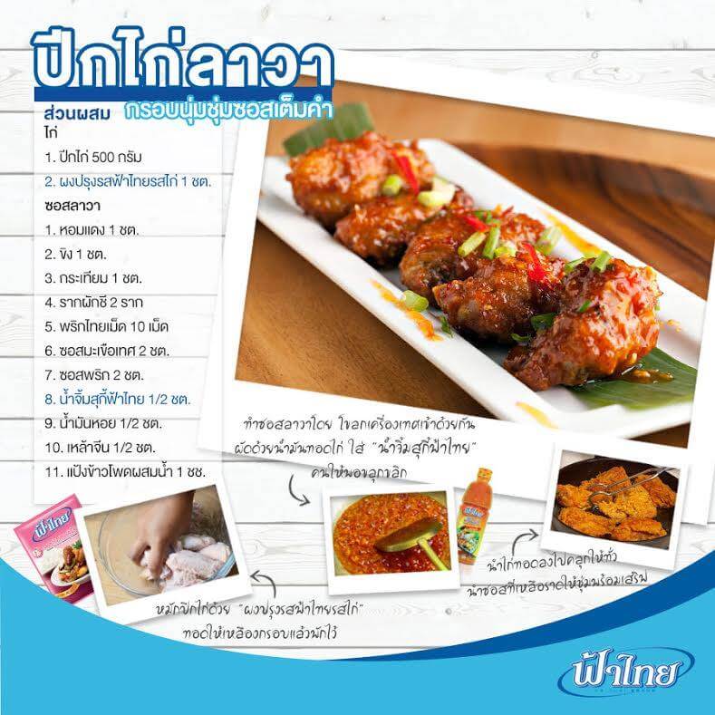 หน้าหนาวทั้งที มาเพิ่มความอุ่นอร่อยด้วยเมนู ปีกไก่ลาวากันเถอะ ส่วนผสม 1. ปีกไก่Deep-frying: ปีกไก่ ฟ้าไทยChicken 2. Spices: หอมแดง ขิง Garlic รากผักชี พริกไทยเม็ด 3. เครื่องปรุงรสซอสลาวา : ซอสมะเขือเทศ ซอสพริก ผงSukiyakiฟ้าไทย น้ำมันหอย เหล้าจีน แป้งข้าวโพดผสมน้ำ#ฟ้าไทยเติมความสุข2017