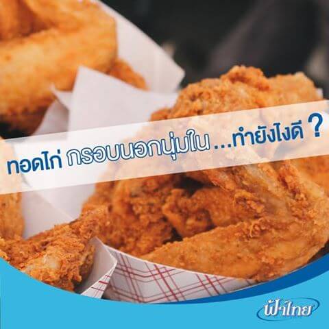 ไก่Deep-fryingรสอร่อย หุ้มด้วยแป้งกร๊อบ กรอบ.. เนื้อข้างในหวานชุ่มฉ่ำสุกกำลังดี มีเคล็ดลับวิธีง่ายๆ อยู่ที่แป้งDeep-frying จะต้องผสมกับน้ำเย็นจัดให้ตัวแป้งข้นกำลังดี Marinade ไก่ด้วยเครื่องปรุงรสตามชอบและอย่าลืมฟ้าไทยเติมความอร่อย ที่สำคัญลงDeep-fryingในน้ำมันเดือดจัดให้ท้วมชิ้นไก่ จากนั้นลดไฟเป็นปานกลาง ให้เนื้อด้านในสุกกำลังดี ด้านนอกกรอบน่าทาน แค่นี้ก็ได้ไก่Deep-fryingรสอร่อยแล้วล่ะค่ะ #ฟ้าไทย