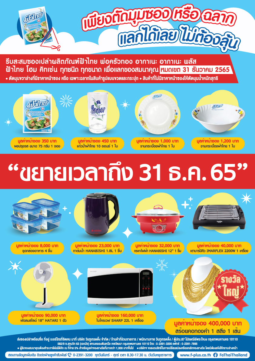 บริษัท เอฟ-พลัส จำกัด (ผลิตภัณฑ์ฟ้าไทย) ได้รับการรับรองเครื่องหมาย Thai SELECT จากกระทรวงพาณิชย์ บริษัท เอฟ-พลัส จำกัด (ผลิตภัณฑ์ฟ้าไทย) มีความภาคภูมิใจเป็นอย่างยิ่งที่ได้รับ เครื่องหมาย Thai SELECT ซึ่งเป็นตราสัญลักษณ์รับรองคุณภาพและความเป็นเลิศของผลิตภัณฑ์อาหารไทย จาก กรมส่งเสริมการค้าระหว่างประเทศ กระทรวงพาณิชย์ ประเทศไทย