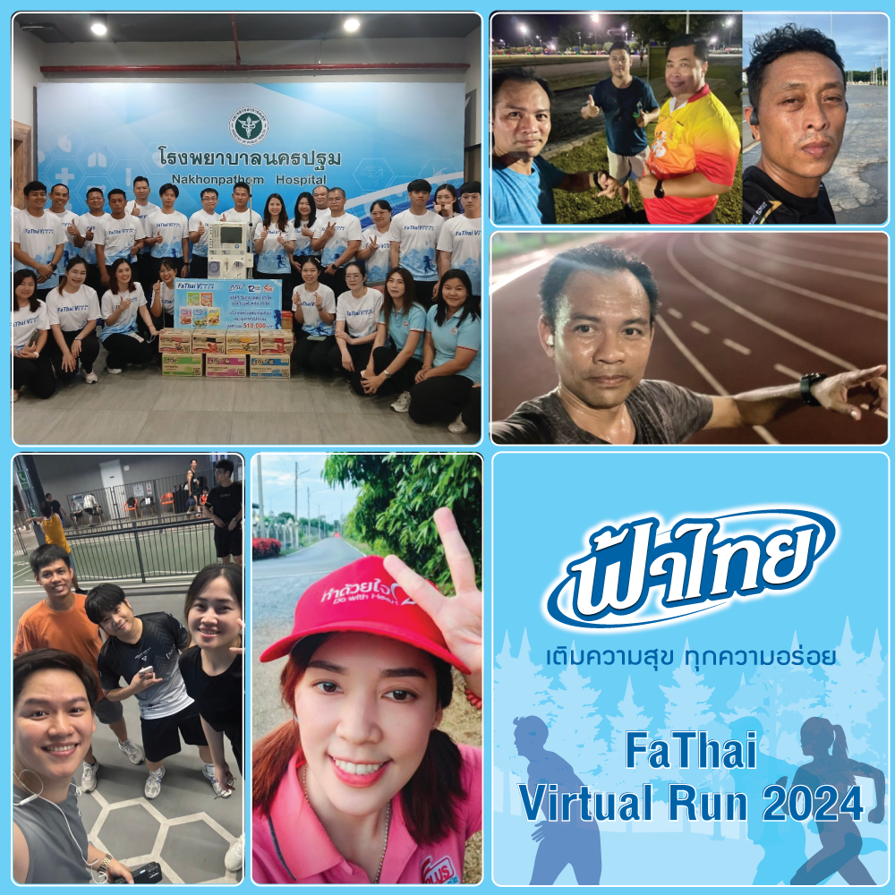 บริษัท เอฟ-พลัส จำกัด และ บริษัท วันทูเทรดดิ้ง จำกัด (แบรนด์ฟ้าไทย) จัดกิจกรรม FaThai Virtual Run 2024 สนับสนุนให้พนักงานเดิน-วิ่งสะสมระยะทาง เพื่อสุขภาพที่แข็งแรง และร่วมสนับสนุนการจัดซื้ออุปกรณ์และเครื่องมือทางการแพทย์ให้กับโรงพยาบาล โดยบริษัทฯ บริจาค 100 บาทต่อการวิ่ง 1 กิโลเมตร กิจกรรมตั้งแต่วันที่ 10 สิงหาคม ถึง 30 กันยายน 2567 รวม 52 วัน โดยบริษัทฯ ได้ทำการบริจาคเครื่องฟอกไตเทียมและอุปกรณ์ไส้กรอง ให้โรงพยาบาลนครปฐม มูลค่ารวมทั้งสิ้น 510,000 บาท เมื่อวันที่ 25 ตุลาคม 2567